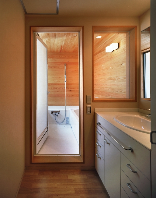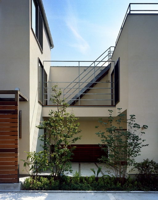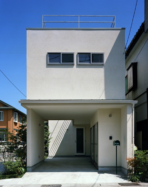 住宅街ではなく、バスも通う商店街なので、表通りと玄関が接していると落ち着きません。 離れを表通り側に配し、その1階とエアスペースを、母屋玄関に続くアプローチとしました。前述しましたが、商店街という外部と、住宅というプライヴェートを分断せず、やわらかく連続させるように。 (同様のコンセプトに SUMiZ 荏田南コートハウス。併せてご参照ください) アプローチではありますが、大容量の物置もビルドインし、パーキング、作業、その気になればビリヤードプールや卓球台も置け、暮らしを楽しくします。 楽しみ=アミューズメント性、というのは住宅の評価軸としてあまり採用されませんが、SUMiZ はかなり重要な要素と考えています。 |
