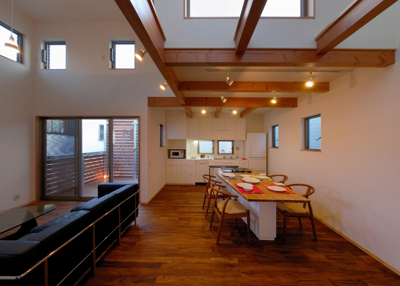 ■木造ながら、剛床構造、筋交いで補強された壁構造により、長スパン大空間を実現 ■カウンターには、米・JENN-AIR社のグリル、独・MIELE社食洗機がビルドインされる