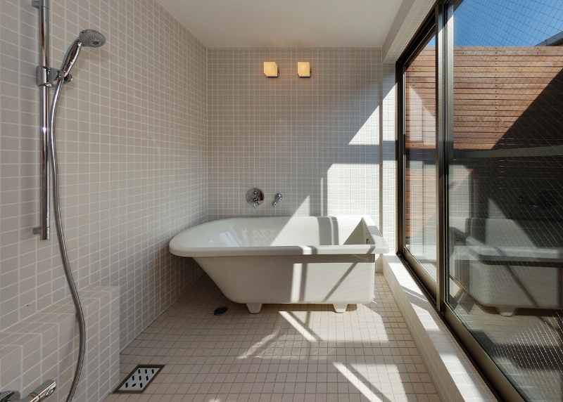 バスタブは可搬、ウッドデッキにも給湯排水設備を設け、つまり、都市型住宅でありながら露天風呂も楽しめるのです。